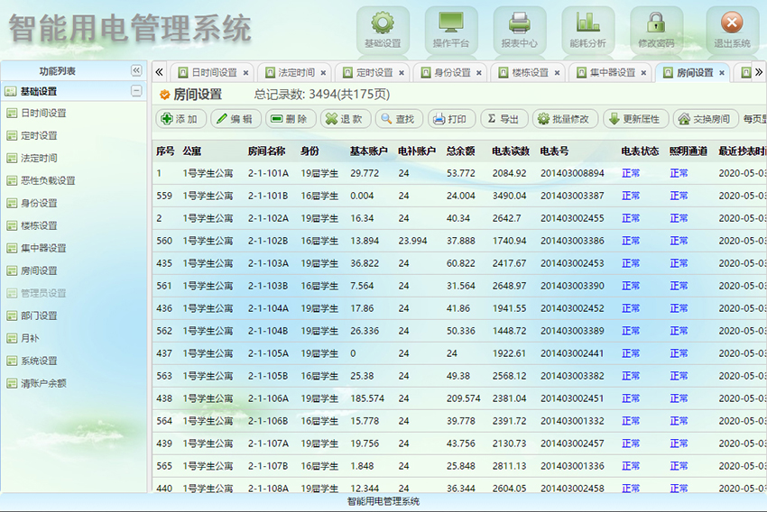 房間調換進行數據轉換:當學生調換房間后,系統計算機上能對學生宿舍的剩余電量進行數據轉換,并且支持個別、批量房間進行數據調換;