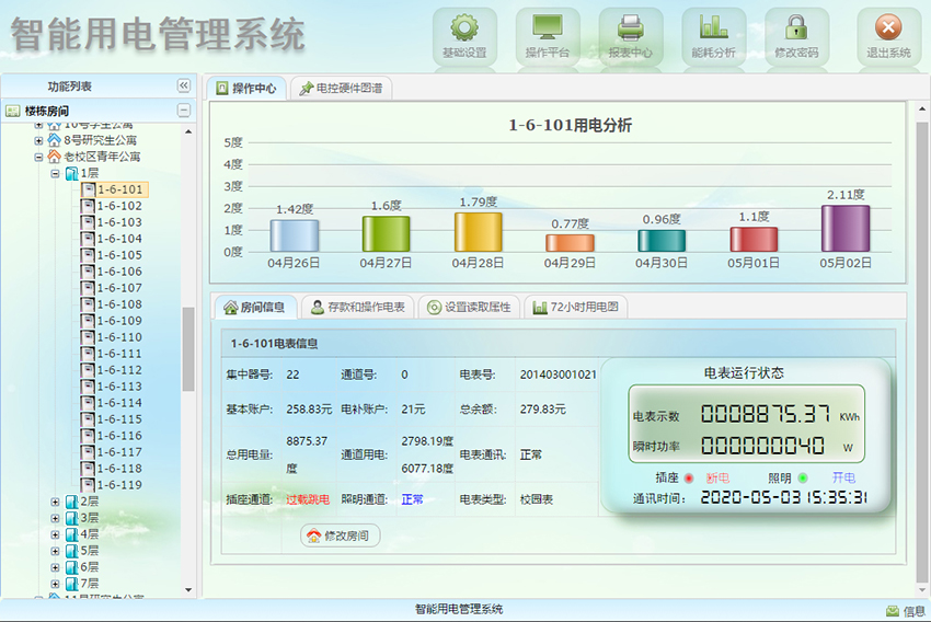 實時監控:對每個學生房間的用電情況進行實時監控,直觀顯示學生房間當前的用電數據(當前電流、剩余電量、已用電量、用電情況等),并且支持多種展現形式;